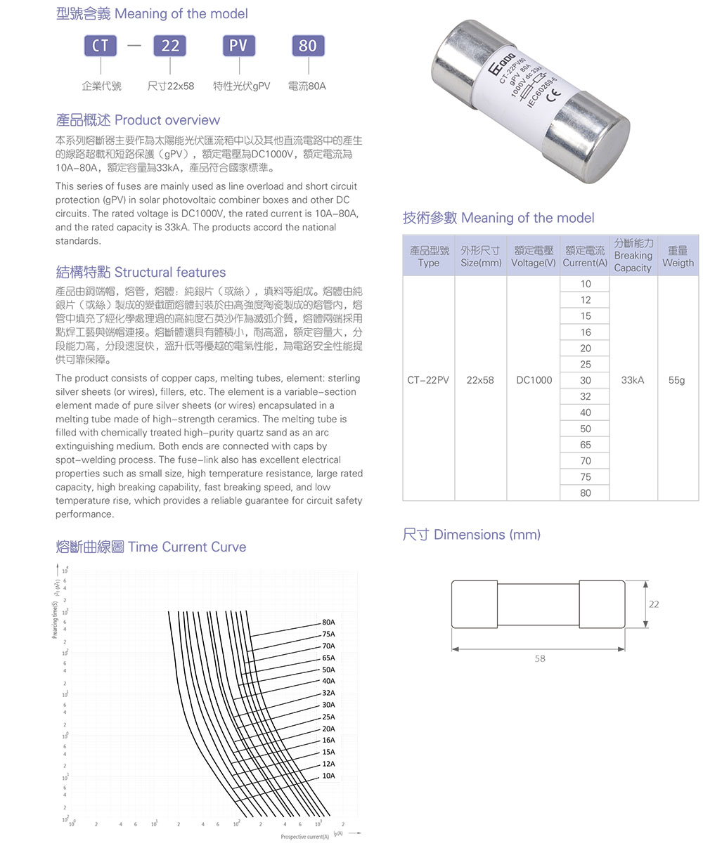 本系列熔斷器主要作為太陽能光伏匯流箱中以及其他直流電路中的產生的線路超載和短路保護(gPV),額定電壓為DC1000V,額定電流為10A-80A,額定容量為33kA,產品符合國家標準。